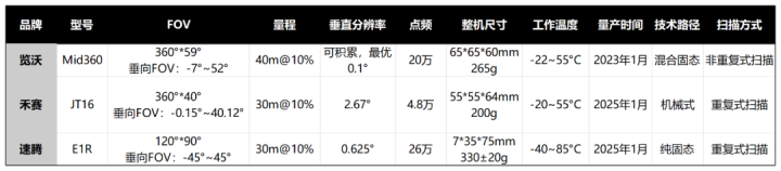 本次主要聚焦于览沃Mid360、禾赛JT16、速腾E1R这三款在机器人导航和避障方面具有代表性的激光雷达产品。首先奉上三款雷达的核心参数一览表,方便直观对比。