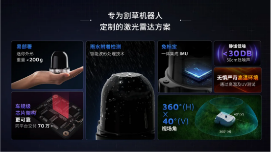 禾赛 JT16 以轻量化、低功耗和成本优势为核心,通过半球形+环扫方案,切入割草等低速机器人场景,持续为客户提供高性价比激光雷达产品。